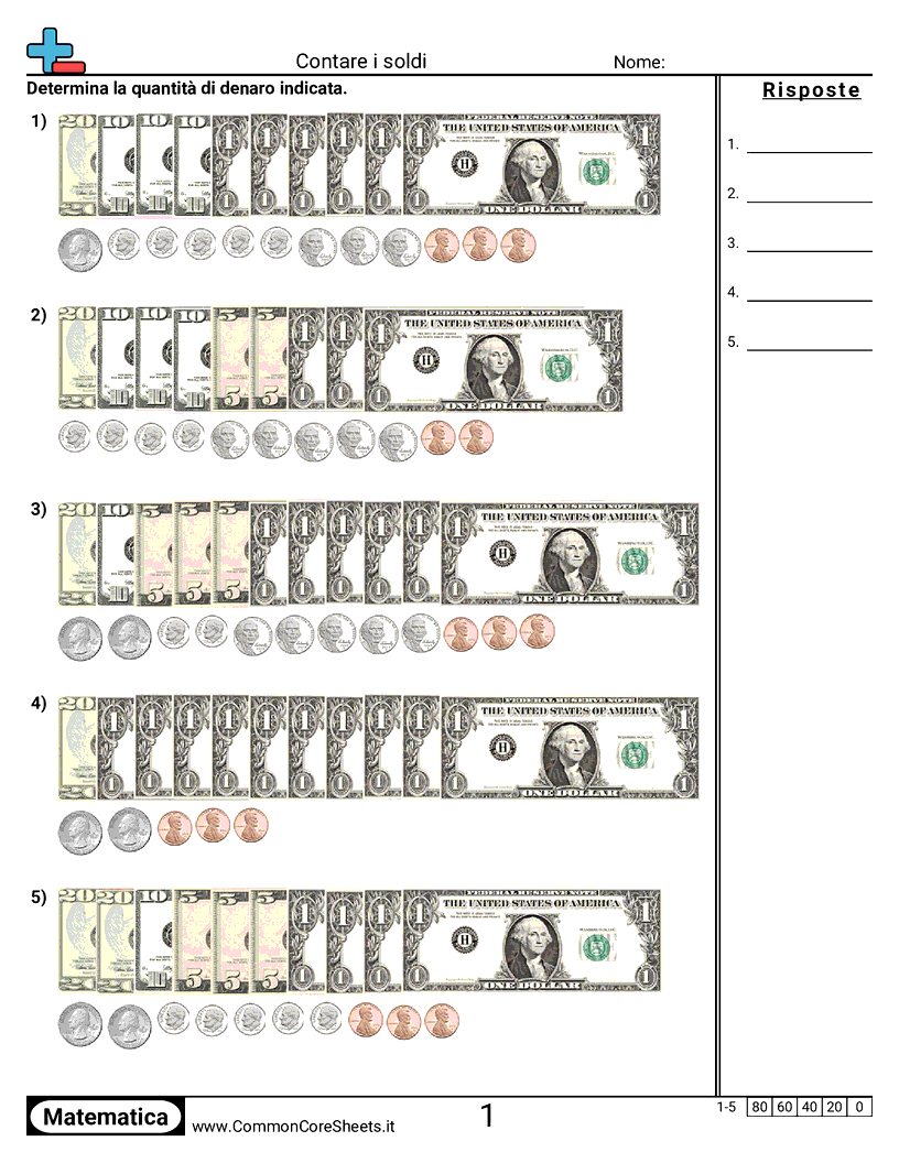 Schede di lavoro gratuite di math su Contare i soldi. Ogni scheda contiene 5 esercizi con soluzioni ed è ideale per insegnanti e istruzione a casa. Puoi scaricare il PDF, creare flashcard o impostarlo per l'apprendimento online.