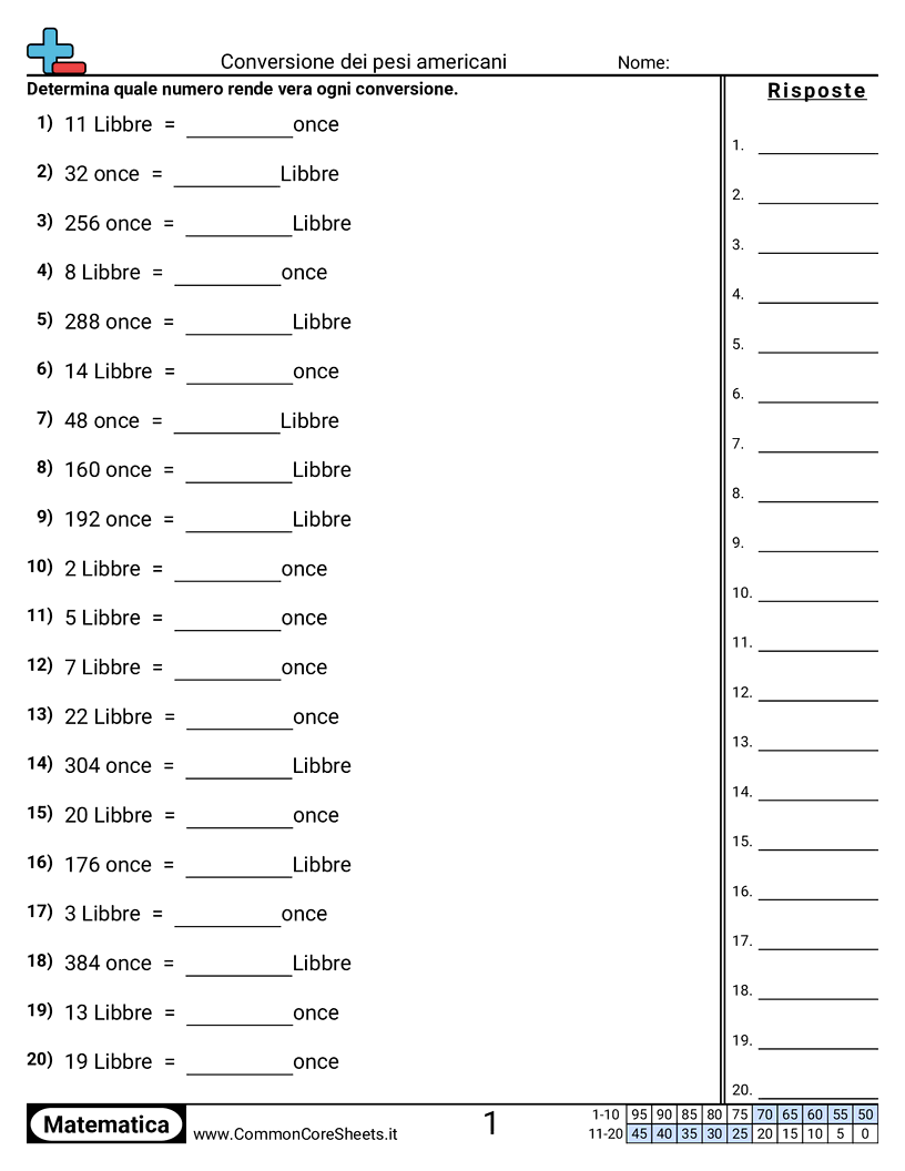 Schede di lavoro gratuite di math su Conversione dei pesi americani. Ogni scheda contiene 20 esercizi con soluzioni ed è ideale per insegnanti e istruzione a casa. Puoi scaricare il PDF, creare flashcard o impostarlo per l'apprendimento online.