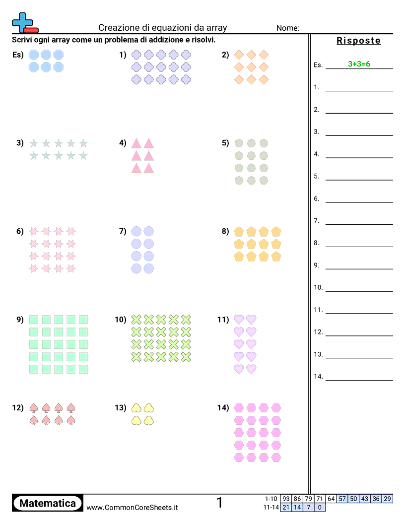 Schede di lavoro gratuite di math per 2ª Elementare (2oa4) su Creazione di equazioni da array . Ogni scheda contiene 14 esercizi con soluzioni ed è ideale per insegnanti e istruzione a casa. Puoi scaricare il PDF, creare flashcard o impostarlo per l'apprendimento online.