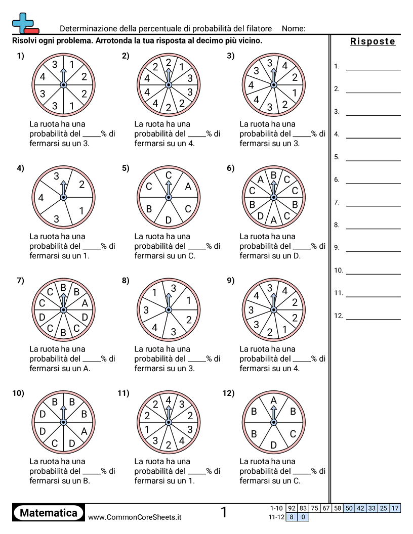 Schede di lavoro gratuite di math su Determinazione della percentuale di probabilità del filatore. Ogni scheda contiene 12 esercizi con soluzioni ed è ideale per insegnanti e istruzione a casa. Puoi scaricare il PDF, creare flashcard o impostarlo per l'apprendimento online.