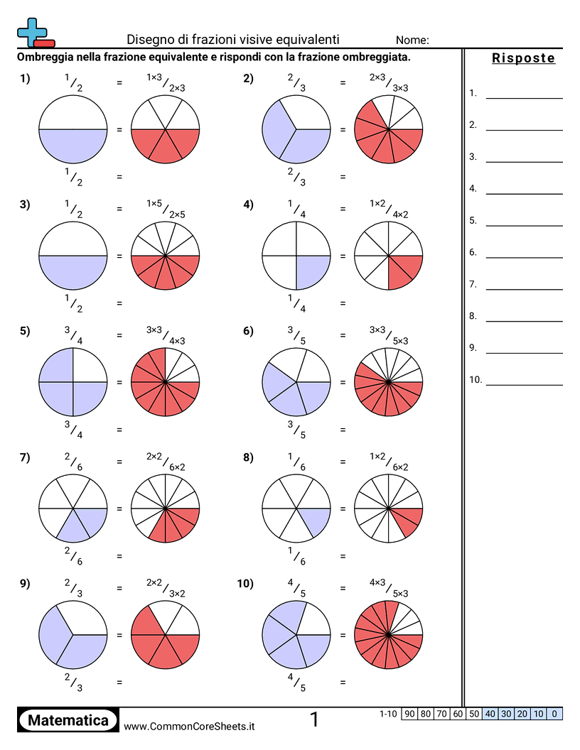 Schede di lavoro gratuite di math per 4ª Elementare (4nf1) su Disegno di frazioni visive equivalenti. Ogni scheda contiene 10 esercizi con soluzioni ed è ideale per insegnanti e istruzione a casa. Puoi scaricare il PDF, creare flashcard o impostarlo per l'apprendimento online.