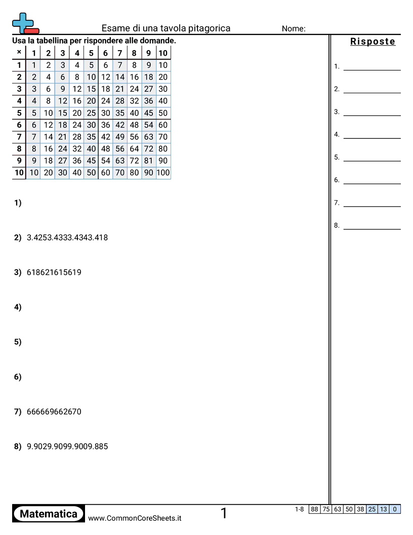 Schede di lavoro gratuite di math per 3ª Elementare (3oa9) su Esame di una tavola pitagorica. Ogni scheda contiene 8 esercizi con soluzioni ed è ideale per insegnanti e istruzione a casa. Puoi scaricare il PDF, creare flashcard o impostarlo per l'apprendimento online.