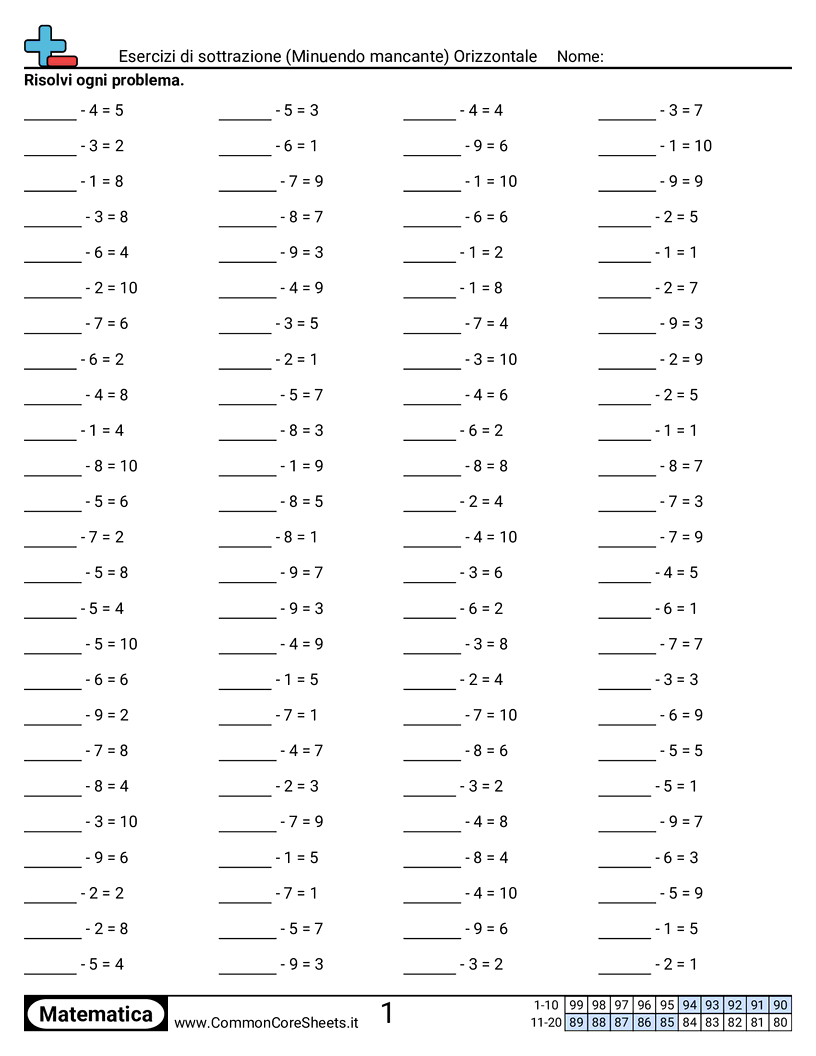 Schede di lavoro gratuite di math su Esercizi di sottrazione (Minuendo mancante) Orizzontale. Ogni scheda contiene 100 esercizi con soluzioni ed è ideale per insegnanti e istruzione a casa. Puoi scaricare il PDF, creare flashcard o impostarlo per l'apprendimento online.