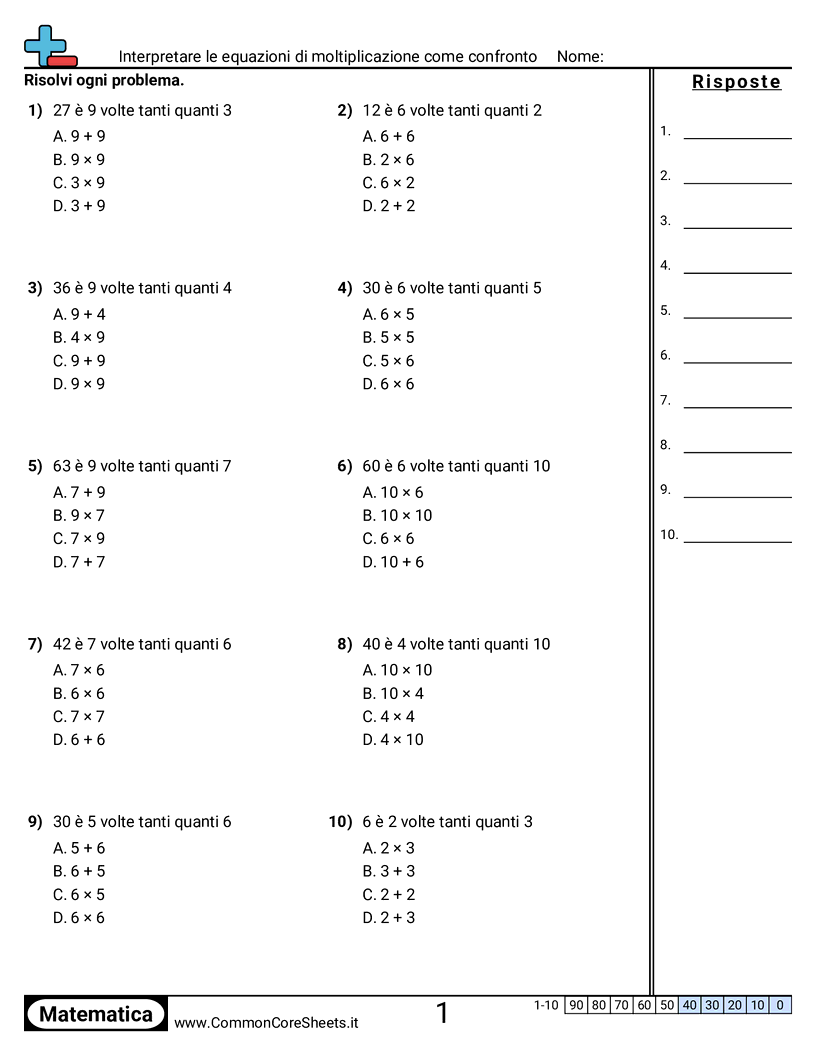 Schede di lavoro gratuite di math per 4ª Elementare (4oa1) su Interpretare le equazioni di moltiplicazione come confronto. Ogni scheda contiene 10 esercizi con soluzioni ed è ideale per insegnanti e istruzione a casa. Puoi scaricare il PDF, creare flashcard o impostarlo per l'apprendimento online.