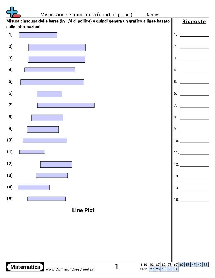 Schede di lavoro gratuite di math su Misurazione e tracciatura (quarti di pollici). Ogni scheda contiene 15 esercizi con soluzioni ed è ideale per insegnanti e istruzione a casa. Puoi scaricare il PDF, creare flashcard o impostarlo per l'apprendimento online.