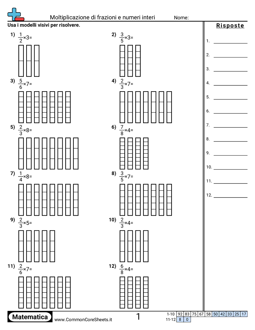 Schede di lavoro gratuite di math per 4ª Elementare (4nf4b) su Moltiplicazione di frazioni e numeri interi. Ogni scheda contiene 12 esercizi con soluzioni ed è ideale per insegnanti e istruzione a casa. Puoi scaricare il PDF, creare flashcard o impostarlo per l'apprendimento online.