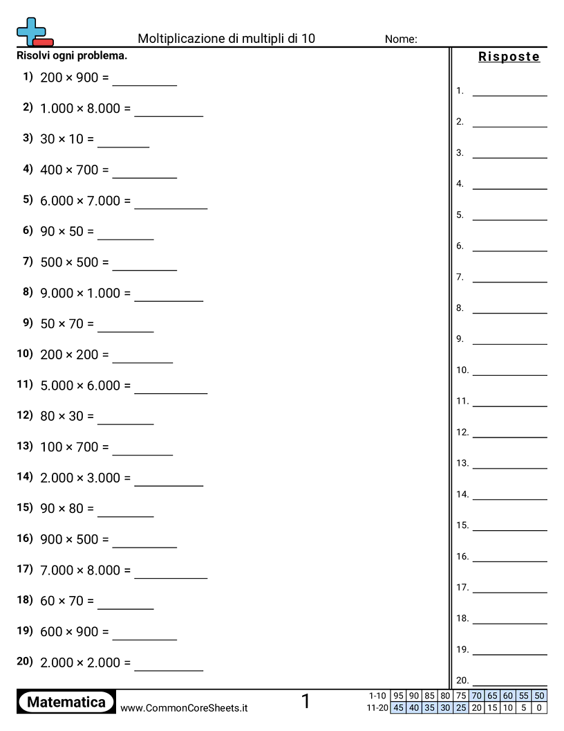 Schede di lavoro gratuite di math su Moltiplicazione di multipli di 10. Ogni scheda contiene 20 esercizi con soluzioni ed è ideale per insegnanti e istruzione a casa. Puoi scaricare il PDF, creare flashcard o impostarlo per l'apprendimento online.
