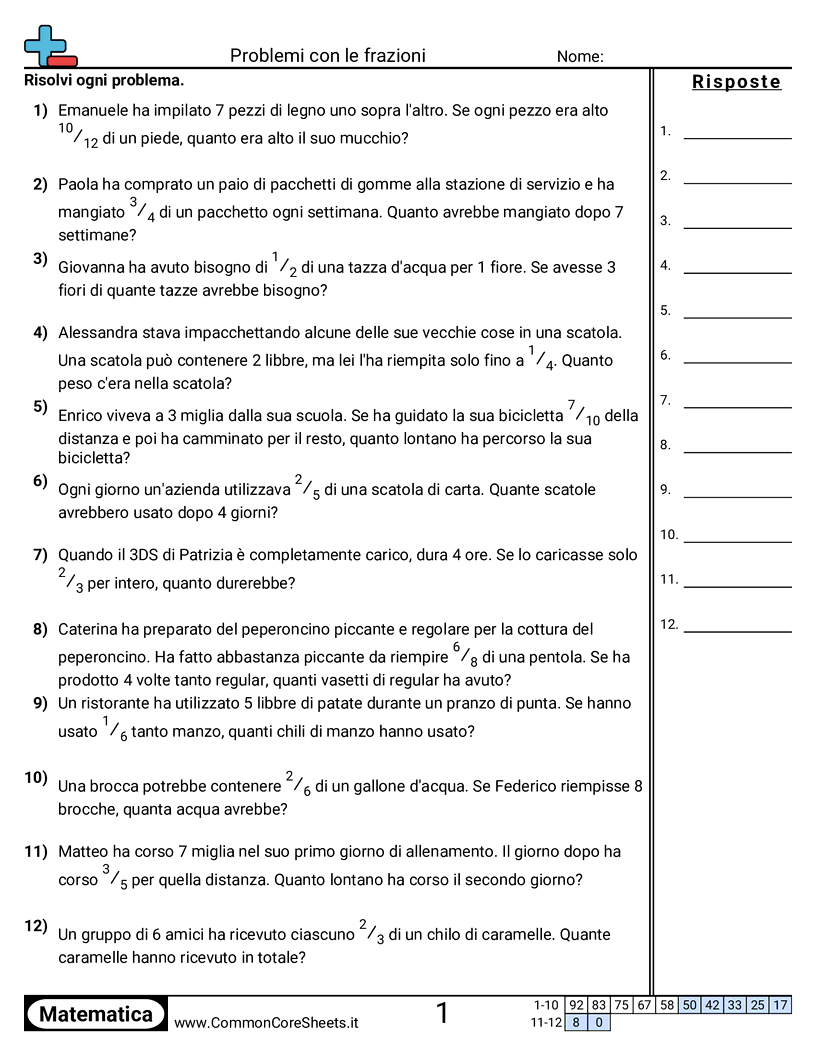 Schede di lavoro gratuite di math per 4ª Elementare (4nf4c) su Problemi con le frazioni. Ogni scheda contiene 12 esercizi con soluzioni ed è ideale per insegnanti e istruzione a casa. Puoi scaricare il PDF, creare flashcard o impostarlo per l'apprendimento online.