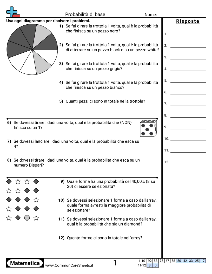 Schede di lavoro gratuite di math su Probabilità di base. Ogni scheda contiene 12 esercizi con soluzioni ed è ideale per insegnanti e istruzione a casa. Puoi scaricare il PDF, creare flashcard o impostarlo per l'apprendimento online.