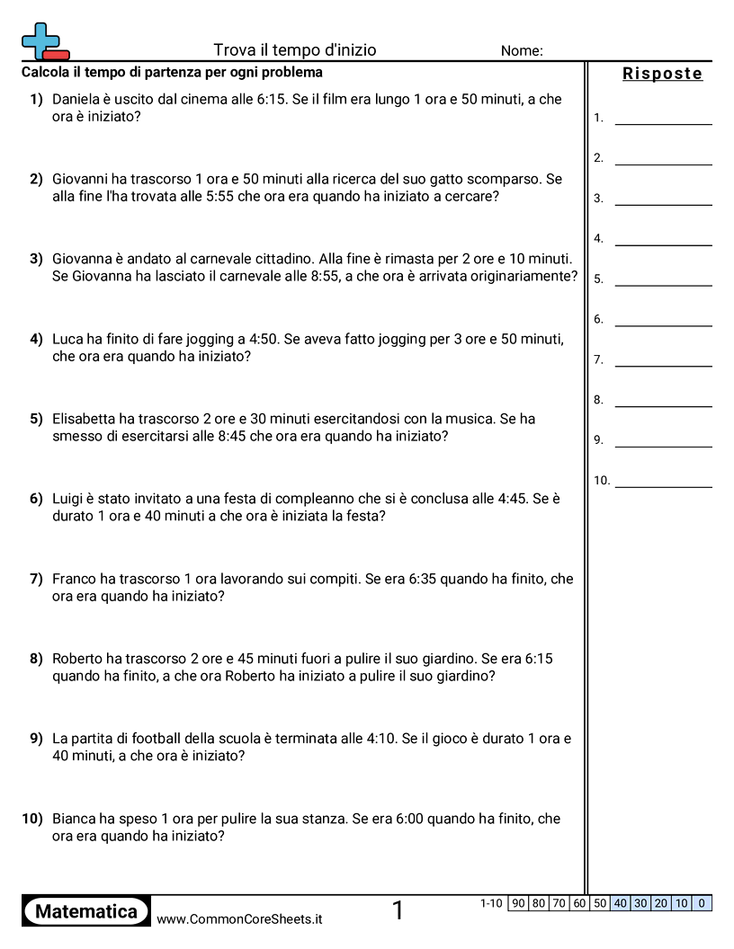 Schede di lavoro gratuite di math per 3ª Elementare (3md1) su Trova il tempo d'inizio. Ogni scheda contiene 10 esercizi con soluzioni ed è ideale per insegnanti e istruzione a casa. Puoi scaricare il PDF, creare flashcard o impostarlo per l'apprendimento online.