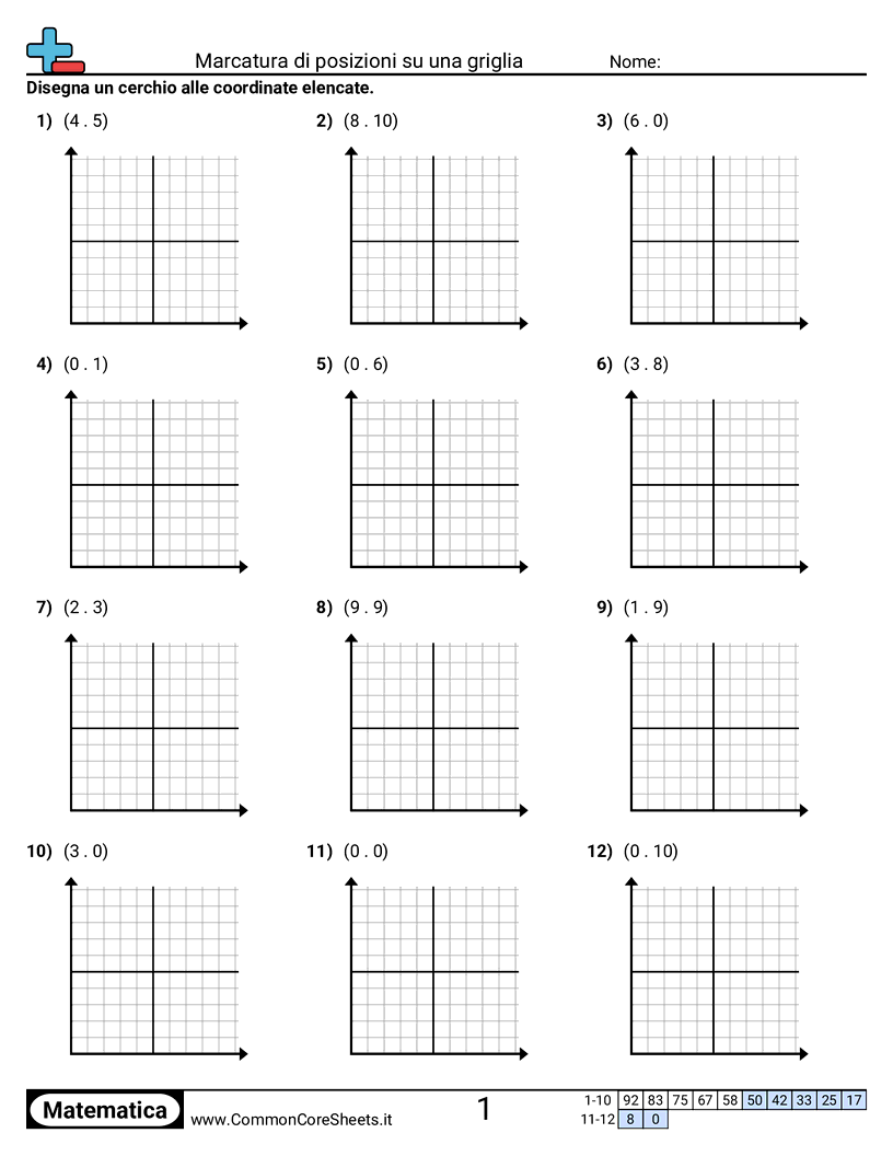 Schede di lavoro gratuite di math per 5ª Elementare (5g1) su Marcatura di posizioni su una griglia. Ogni scheda contiene 12 esercizi con soluzioni ed è ideale per insegnanti e istruzione a casa. Puoi scaricare il PDF, creare flashcard o impostarlo per l'apprendimento online.