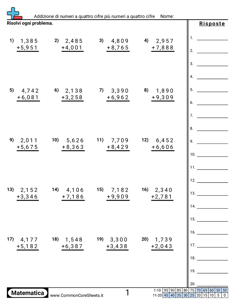 Schede di lavoro gratuite di math per 4ª Elementare (4nbt4) su . Ogni scheda contiene 20 esercizi con soluzioni ed è ideale per insegnanti e istruzione a casa. Puoi scaricare il PDF, creare flashcard o impostarlo per l'apprendimento online.