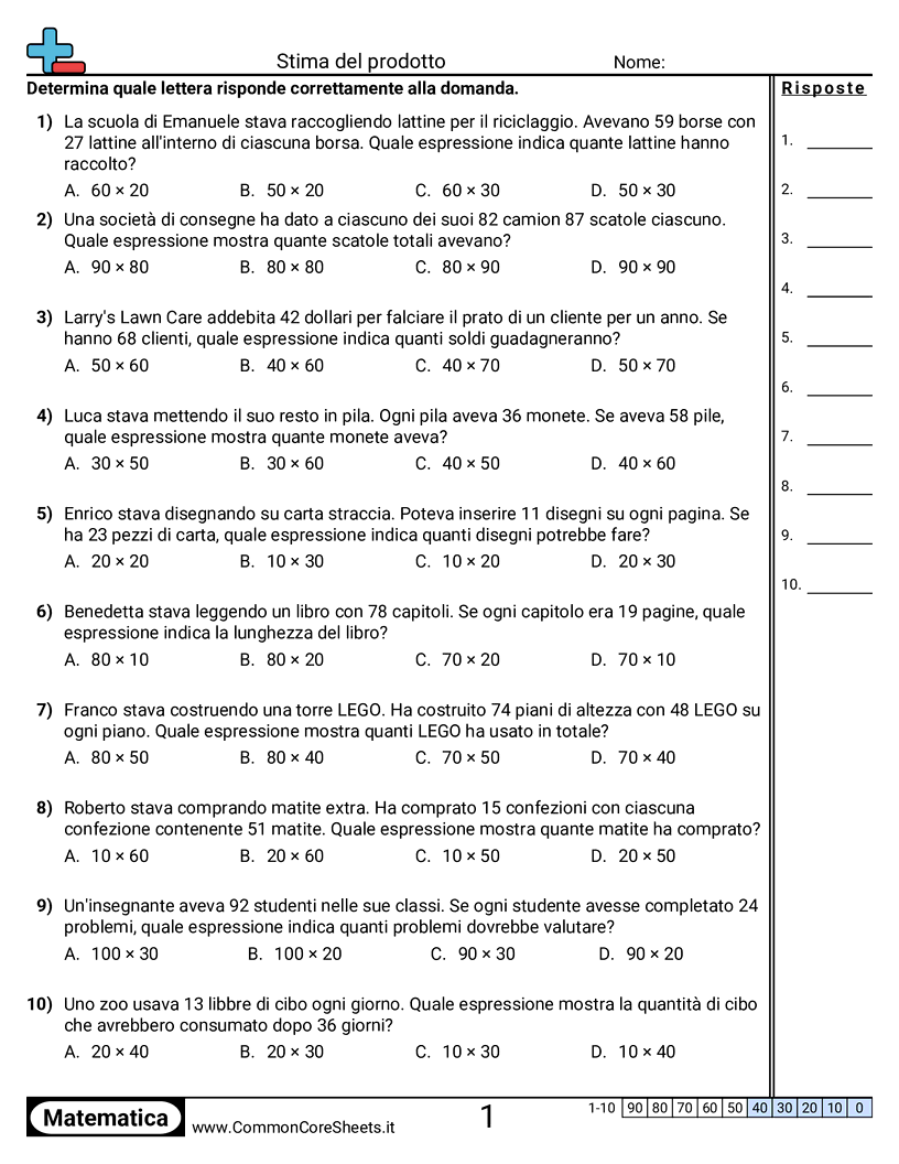 Schede di lavoro gratuite di math per 3ª Elementare (3nbt1) su Stima del prodotto. Ogni scheda contiene 10 esercizi con soluzioni ed è ideale per insegnanti e istruzione a casa. Puoi scaricare il PDF, creare flashcard o impostarlo per l'apprendimento online.