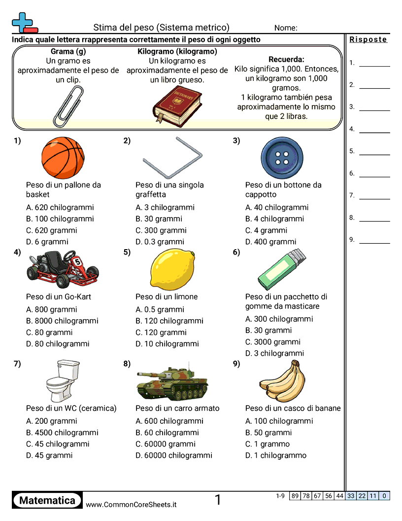 Schede di lavoro gratuite di math per 3ª Elementare (3md2) su Stima del peso (Sistema metrico). Ogni scheda contiene 9 esercizi con soluzioni ed è ideale per insegnanti e istruzione a casa. Puoi scaricare il PDF, creare flashcard o impostarlo per l'apprendimento online.