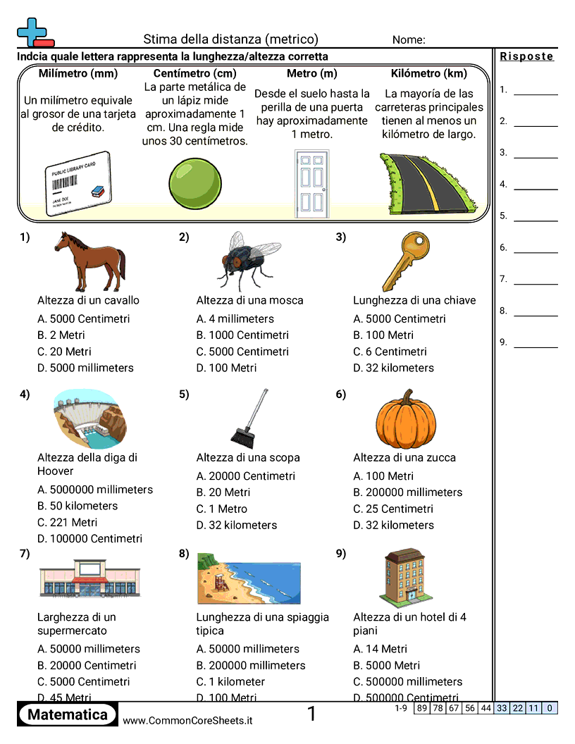 Schede di lavoro gratuite di math per 4ª Elementare (4md1) su Stima della distanza (metrico). Ogni scheda contiene 9 esercizi con soluzioni ed è ideale per insegnanti e istruzione a casa. Puoi scaricare il PDF, creare flashcard o impostarlo per l'apprendimento online.