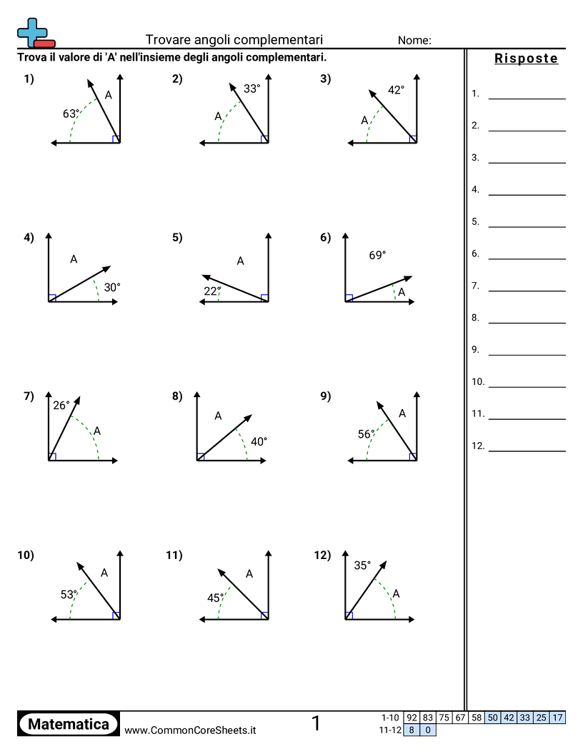 Schede di lavoro gratuite di math per 2ª Media (7g5) su Trovare angoli complementari. Ogni scheda contiene 12 esercizi con soluzioni ed è ideale per insegnanti e istruzione a casa. Puoi scaricare il PDF, creare flashcard o impostarlo per l'apprendimento online.