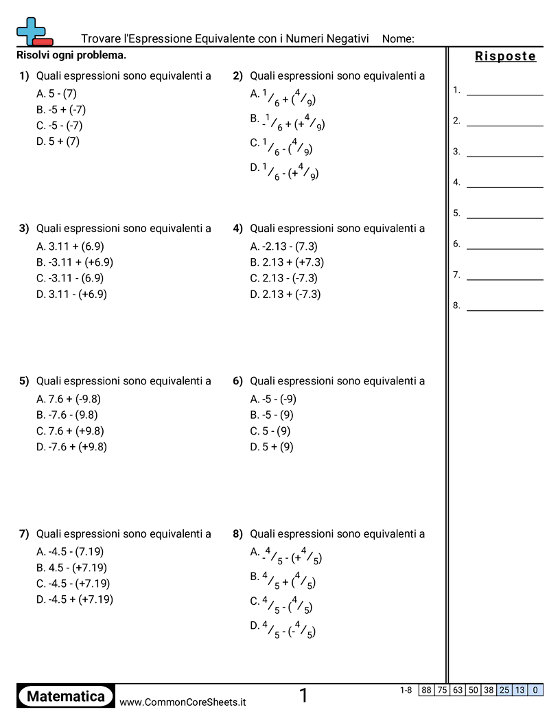 Schede di lavoro gratuite di math per 2ª Media (7ns1c) su Trovare l'Espressione Equivalente con i Numeri Negativi. Ogni scheda contiene 8 esercizi con soluzioni ed è ideale per insegnanti e istruzione a casa. Puoi scaricare il PDF, creare flashcard o impostarlo per l'apprendimento online.